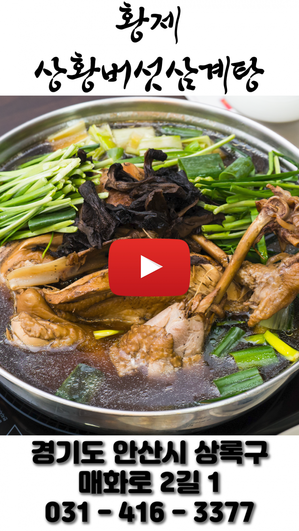 • 황제상황버섯삼계탕 | 주소 : 경기도 안산시 상록구 매화로2길 1 | 대표전화 : 031-416-3377 | 대표 : 황영옥