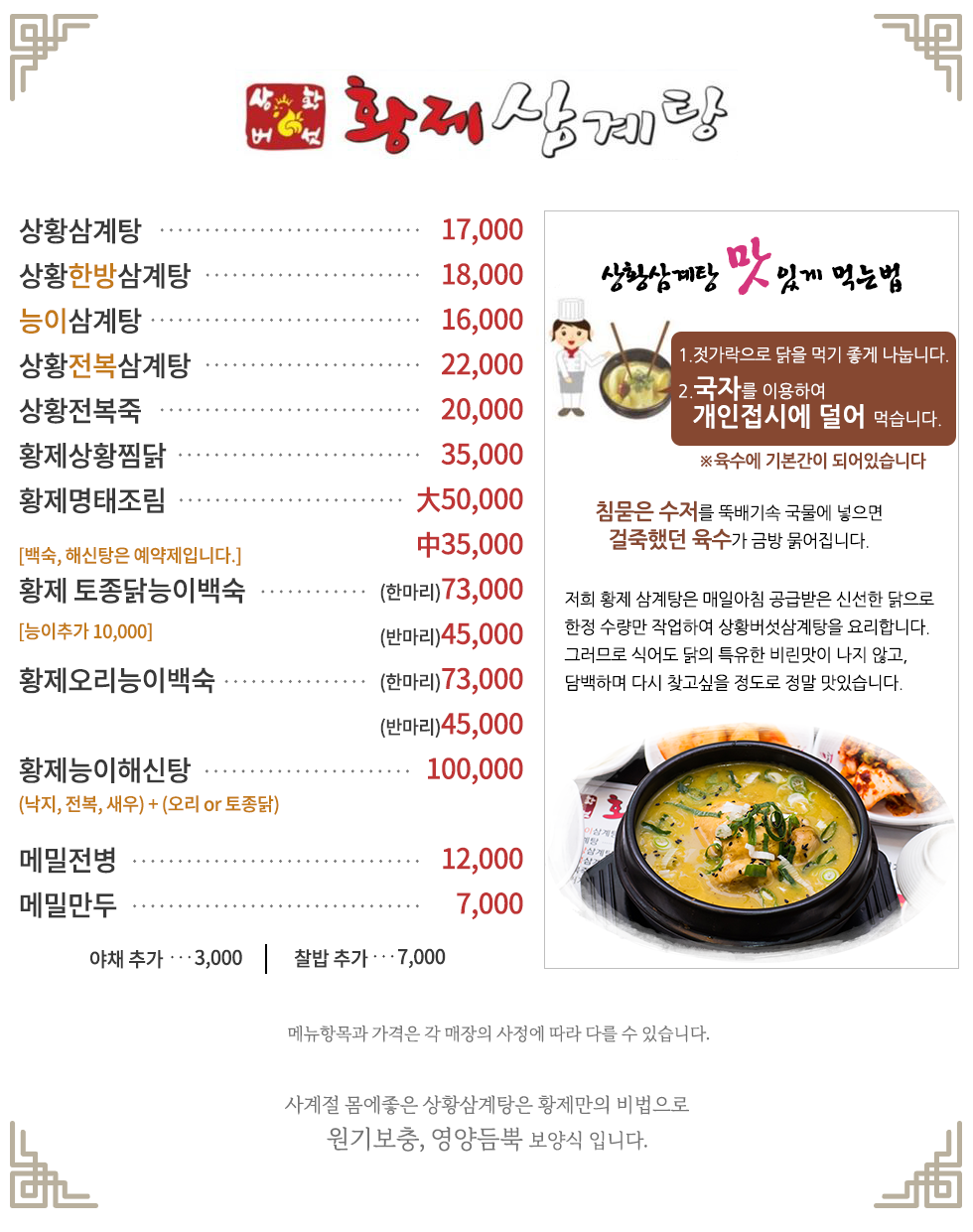 • 황제상황버섯삼계탕 | 주소 : 경기도 안산시 상록구 매화로2길 1 | 대표전화 : 031-416-3377 | 대표 : 황영옥